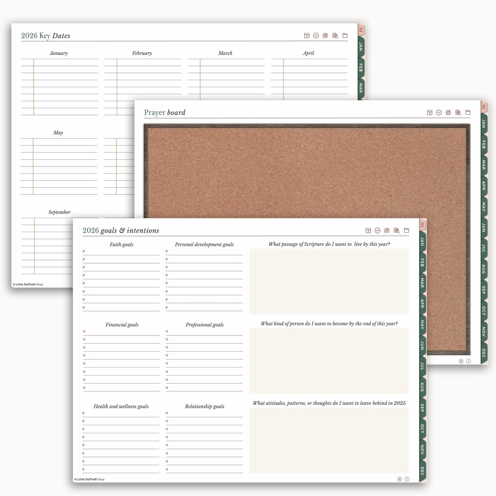 The 2026 Key Dates, Prayer Board, and Goals & Intentions pages are designed to help you start the year strong. While these pages are typically filled out at the beginning of the year, I encourage you to revisit them throughout the year, checking in on your progress, refreshing your yearly goals, and updating your Prayer Board as God answers prayers. This way, these pages become a living reminder of both your intentions and God’s faithfulness throughout the year.