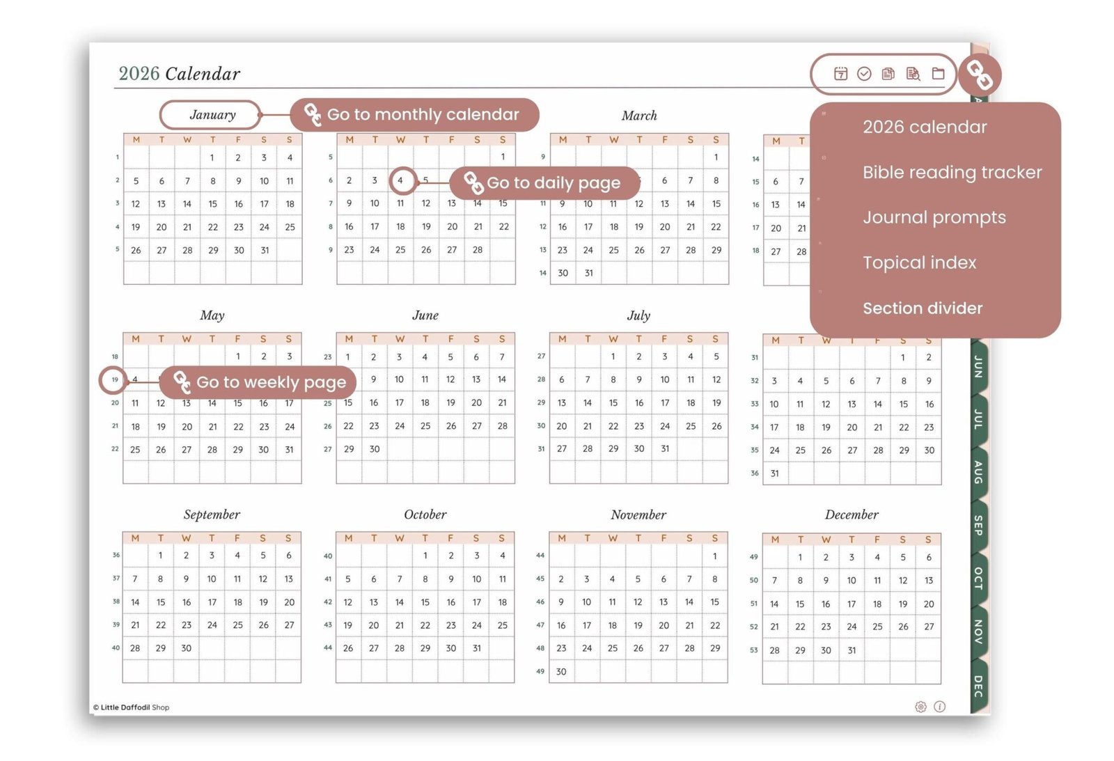 From the 2026 calendar page, you can have a bird’s-eye view of the entire year. Each month, week, and day is also hyperlinked to facilitate navigation.