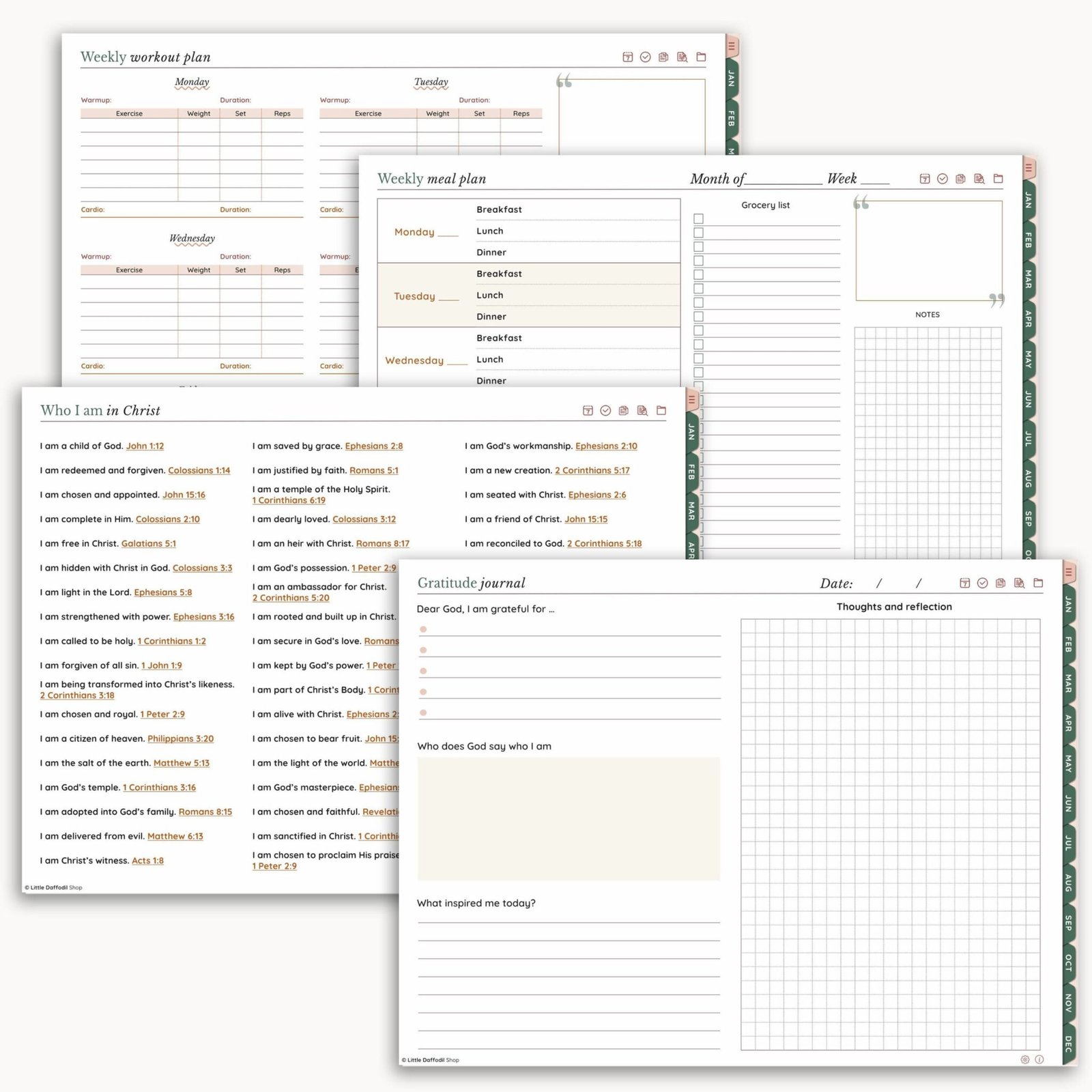 This planner is thoughtfully designed to support your overall wellness journey by providing you with both spiritual and physical resources, such as: